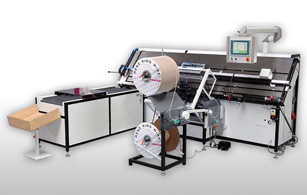 Industrial, high-speed, fully-automatic production RENZ RING WIRE® binding line for books, calendars and skip binding.